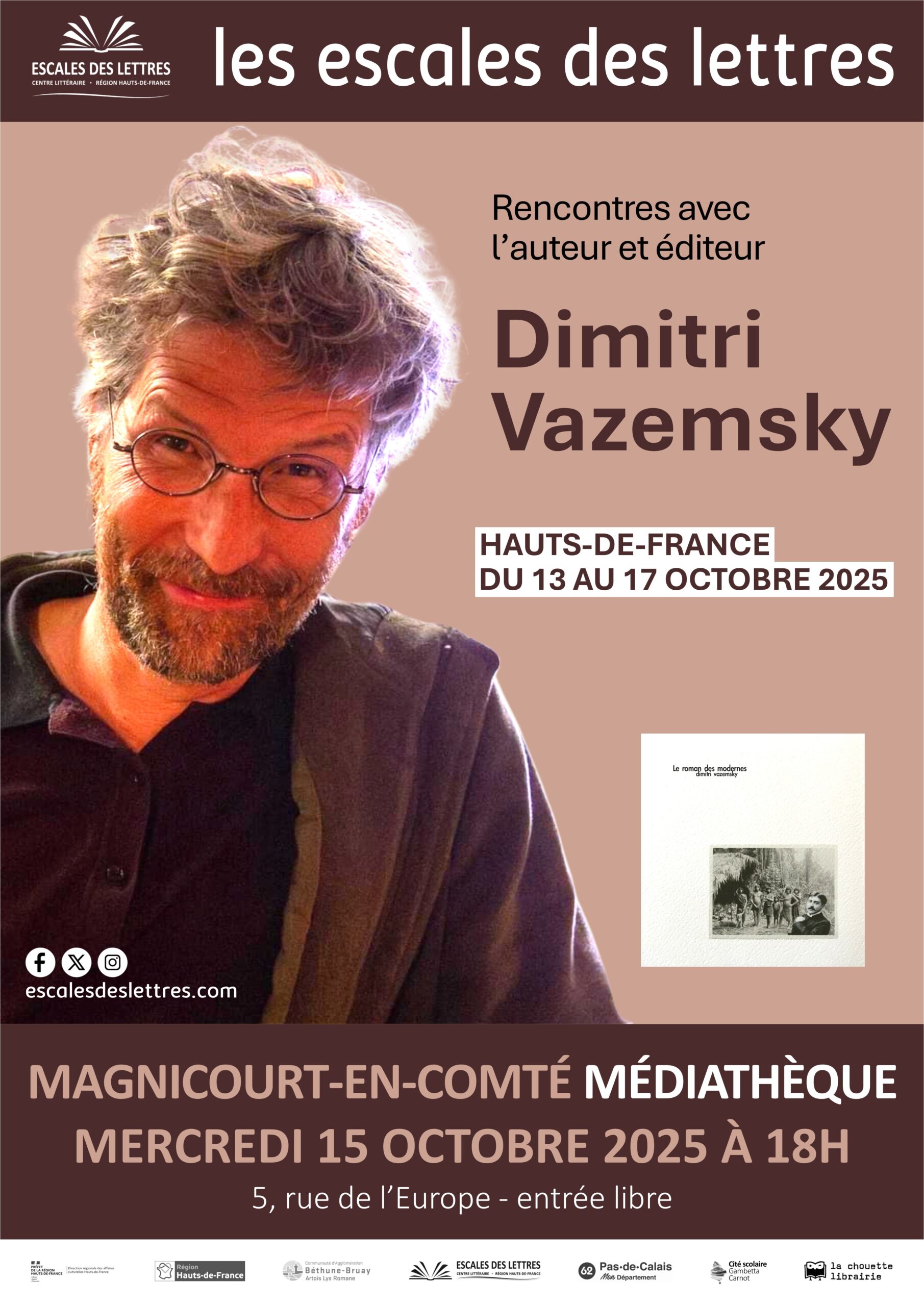 Mercredi 15 octobre à 18h, la médiathèque de Magnicourt en Comté recevra l’auteur Dimitri Vazemski pour une rencontre littéraire animée par Schéhérazade de l’Association Escales des Lettres.
