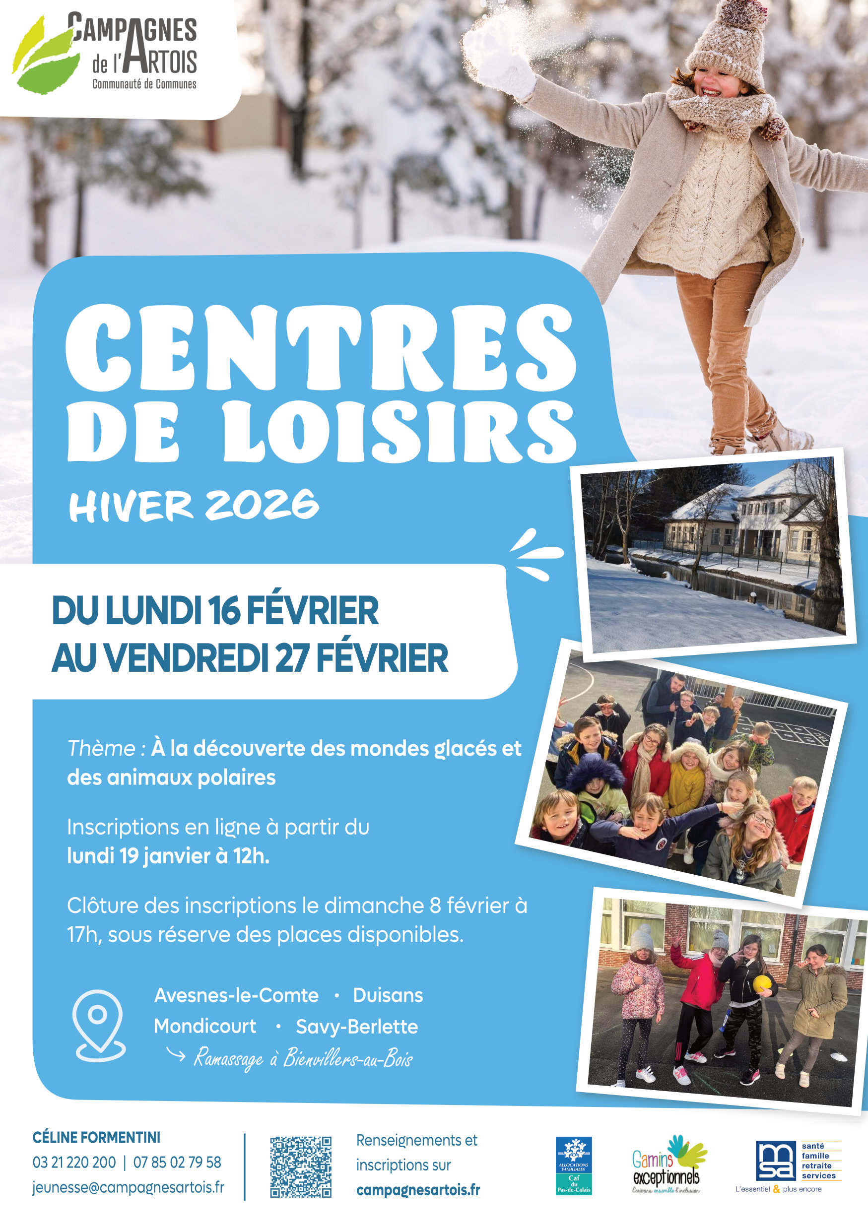 Au programme : des centres de loisirs autour du thème « À la découverte des mondes glacés et des animaux polaires », du lundi 16 février au vendredi 27 février 2026, sur les sites d’Avesnes-le-Comte, Duisans, Mondicourt et Savy-Berlette (ramassage à Bienvillers-au-Bois).