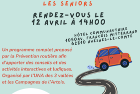 Les Campagnes de l’Artois et l’UNAUnion Nationale de l'Aide des 3 Vallées organisent une conférence-forum “Prévention à la Sécurité Routière pour les seniors”, le vendredi 12 avril à 14h au siège de la Communauté de Communes à Avesnes-le-Comte.