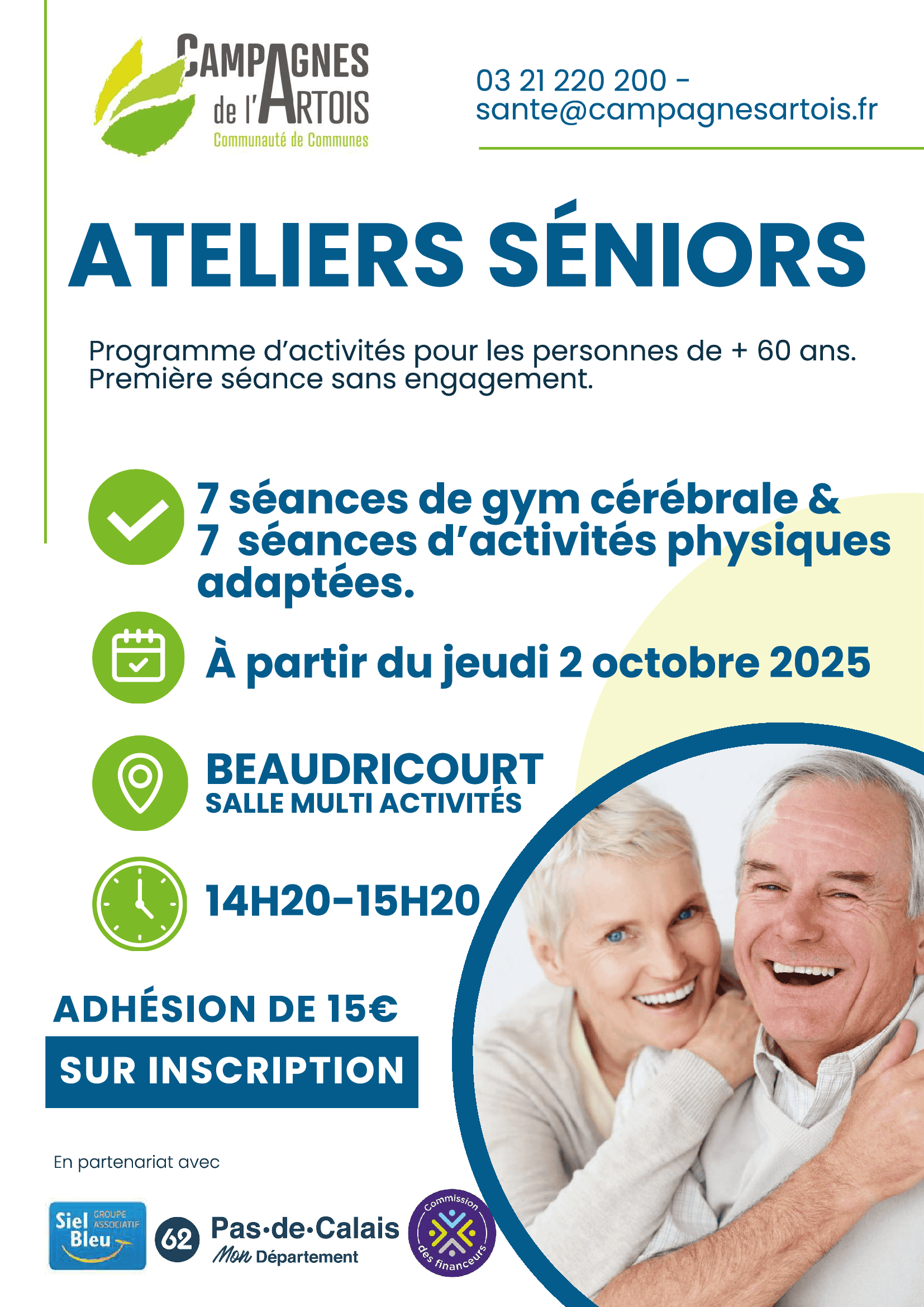 Des ateliers pour les plus de 60 ans (activité physique adaptée et gym cérébrale) sont proposés chaque jeudi de 14h20 à 15h20 à Beaudricourt (salle multi-activités).