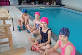 16 enfants de 7 à 9 ans participent à une séance de piscine d’une heure tous les matins du lundi au vendredi.