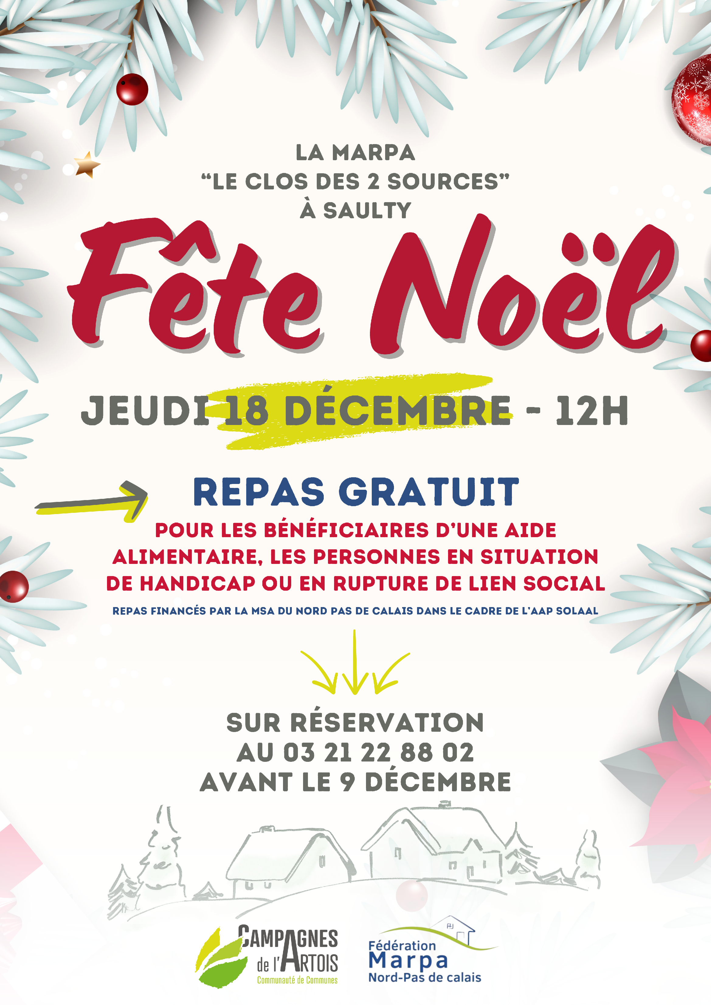 Ce repas solidaire est financé par la MSAMutualité Sociale Agricole du Nord-Pas-de-Calais dans le cadre du programme Solaal, et soutenu par la Fédération MarpaMaisons d'Accueil Rural pour Personnes Agées Nord-Pas-de-Calais et la Communauté de Communes des Campagnes de l’Artois.