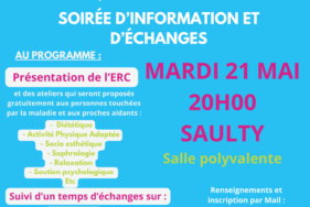 La CCCACommunauté de Communes des Campagnes de l'Artois et la Commune de Saulty vous invitent à participer à une grande soirée d’information sur l’Espace Ressources Cancers et sur le dépistage : le mardi 21 mai à 20h à Saulty.