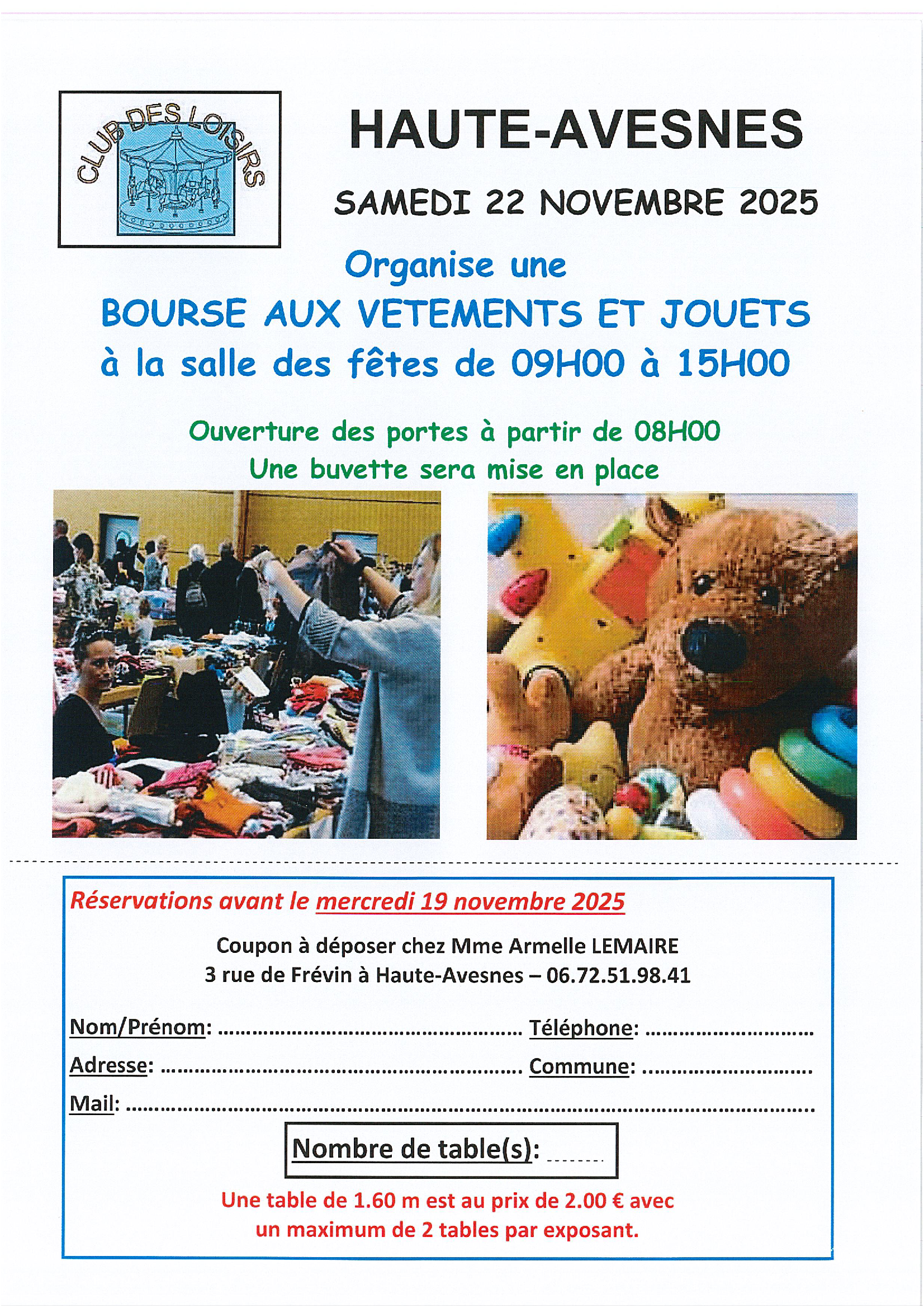 Rendez-vous le samedi 22 novembre à la salle des fêtes de Haute-Avesnes pour une bourse conviviale dédiée aux vêtements et jouets, avec buvette sur place.
