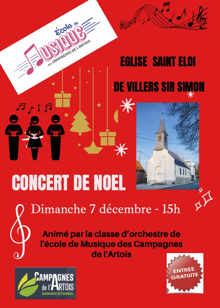 Rendez-vous dimanche 7 décembre 2025 à 15h en l’église Saint-Éloi de Villers-sir-Simon pour un concert de Noël animé par la classe d’orchestre de l’École de Musique des Campagnes de l’Artois.