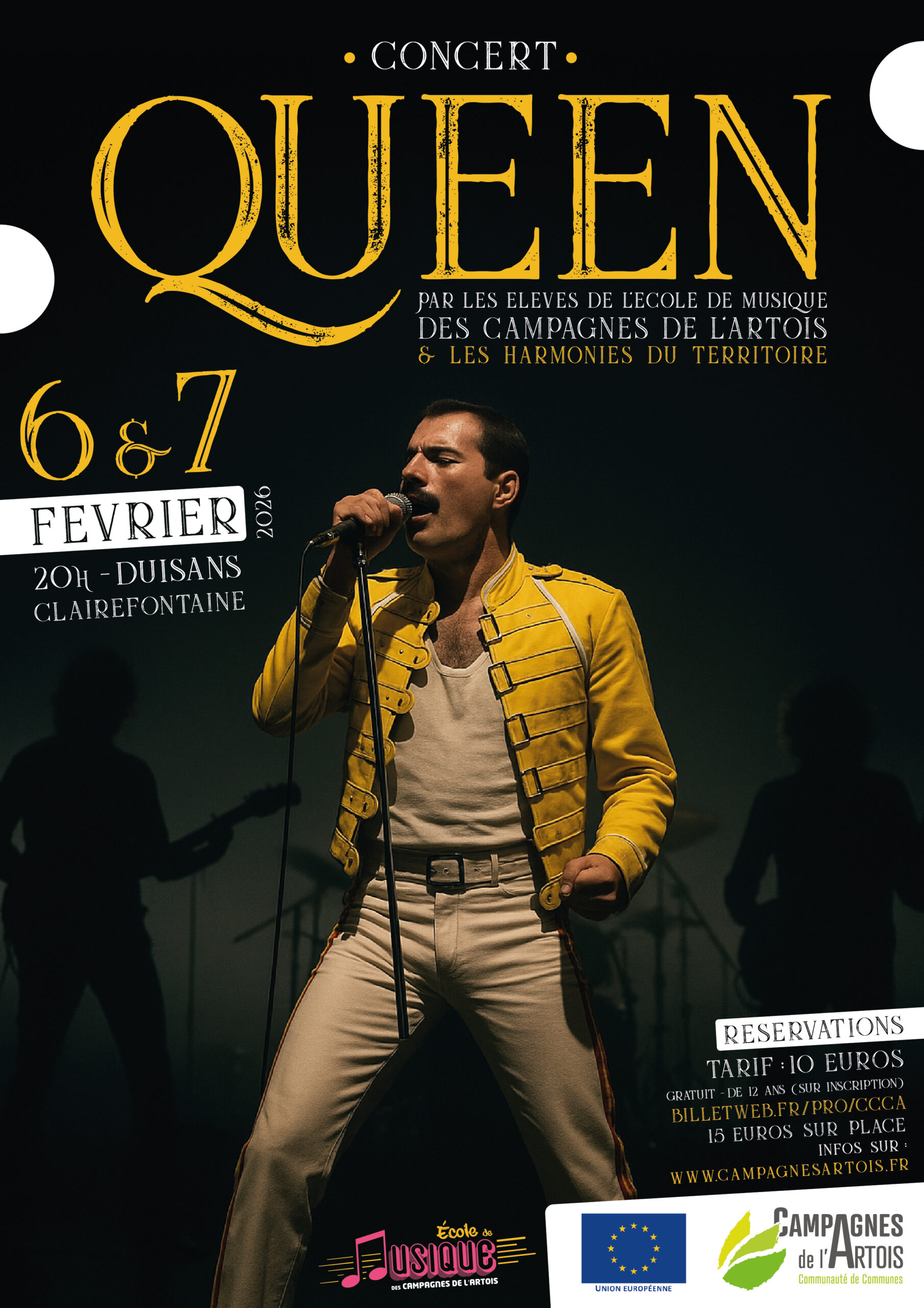 Rendez-vous les vendredi 6 et samedi 7 février 2026 à 20h, à la salle Clairefontaine de Duisans, pour un concert hommage à Queen, interprété par les élèves de l’École de musique des Campagnes de l’Artois et les harmonies du territoire.