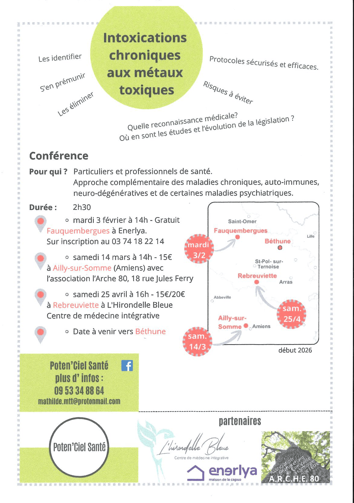 Rendez-vous le samedi 25 avril à 16h à Rebreuviette, à l’Hirondelle Bleue – Centre de médecine intégrative, pour une conférence dédiée aux intoxications chroniques aux métaux toxiques.