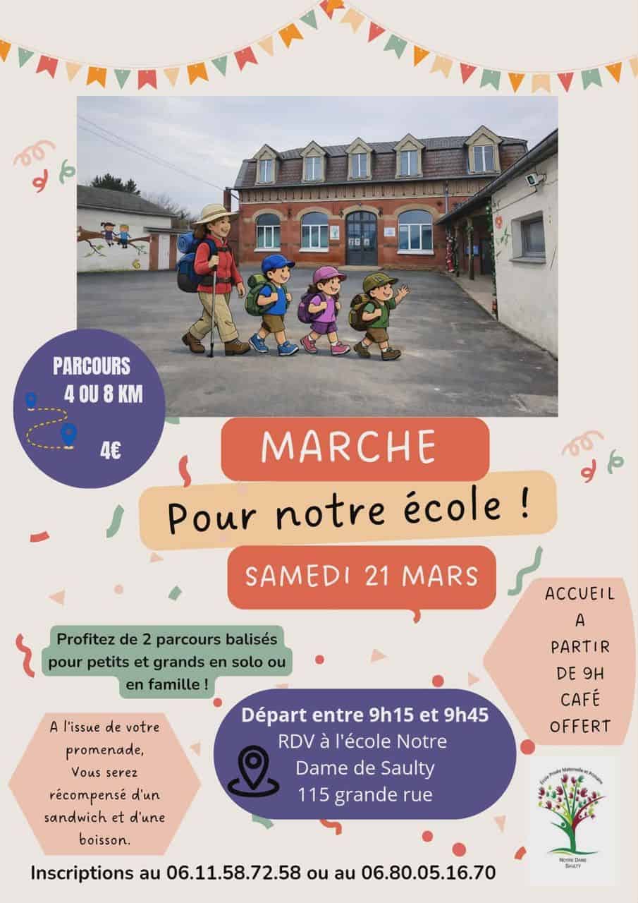 Rendez-vous le samedi 21 mars dès 9h à l’école Notre Dame (115 Grande Rue à Saulty) pour une marche conviviale de 4 ou 8 km au profit de l’école.