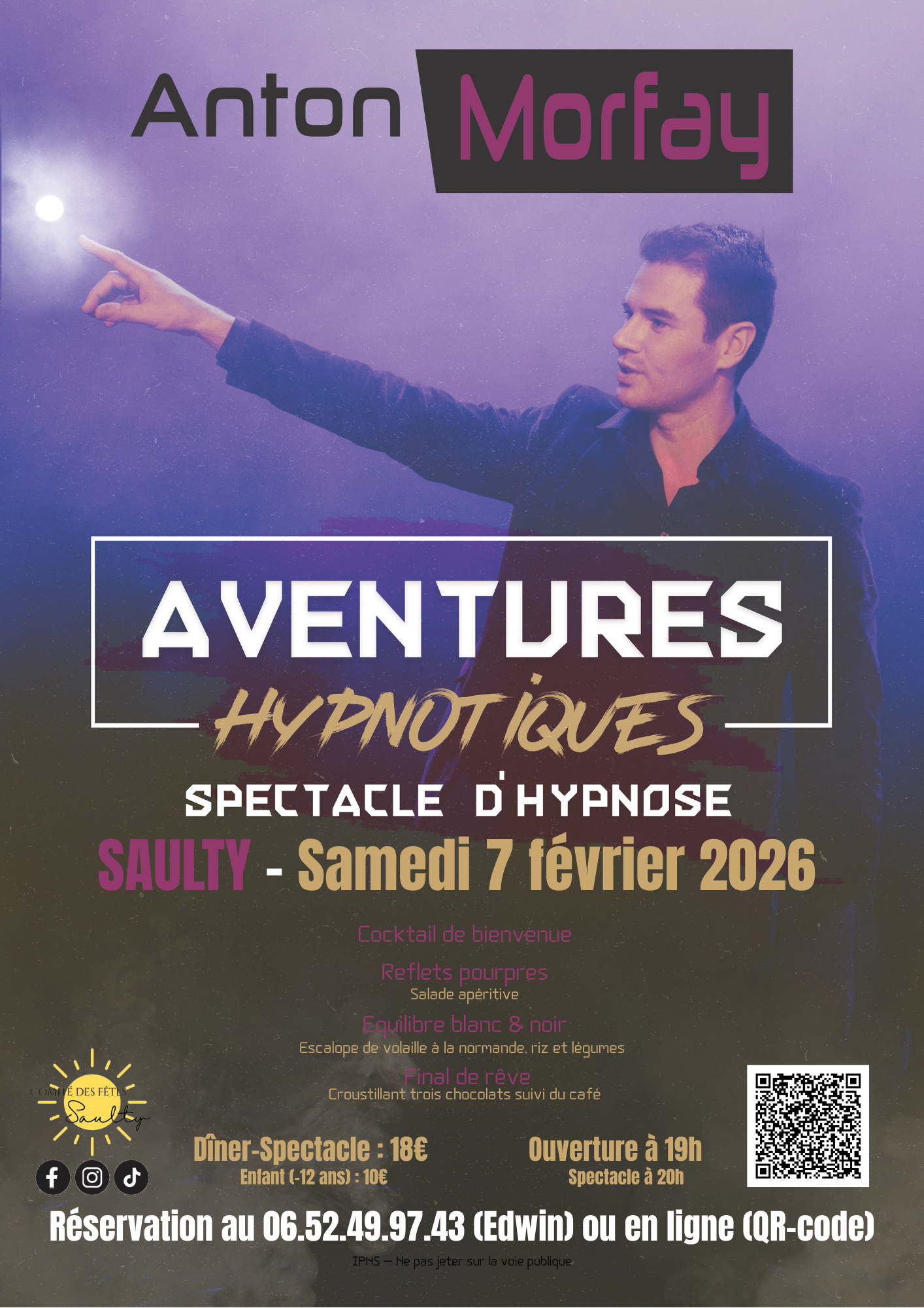 Rendez-vous le samedi 7 février 2026 à Saulty, pour une soirée dîner-spectacle d’hypnose avec Anton Morfay, mêlant humour, mystère et expériences hypnotiques, à partir de 19h à la salle des fêtes.