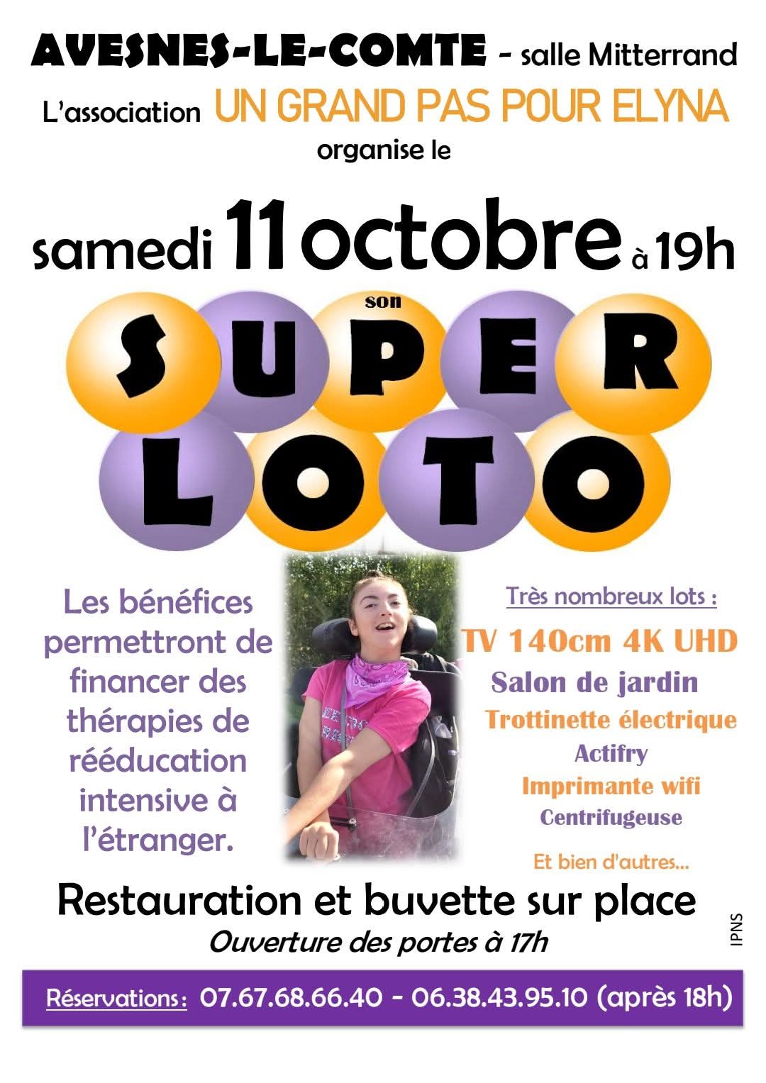 Rendez-vous samedi 11 octobre à Avesnes-le-Comte pour un super loto au profit d’Elyna, avec de nombreux lots à gagner.