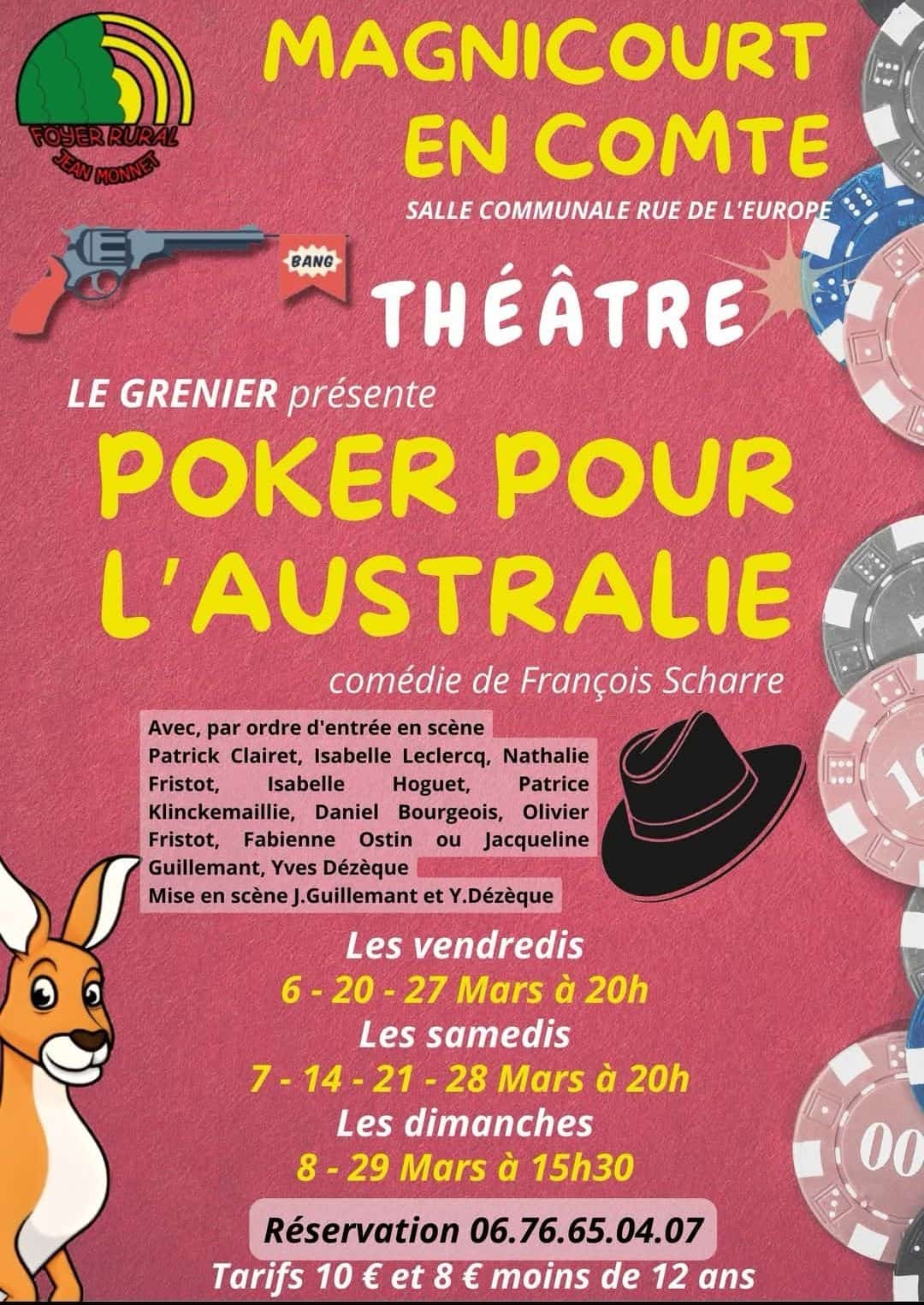Rendez-vous en mars à la salle communale de Magnicourt-en-Comte pour la comédie Poker pour l’Australie, jouée les vendredis, samedis et dimanches.