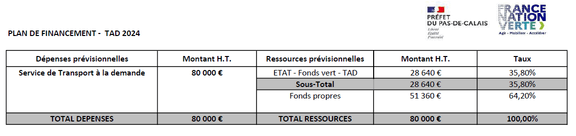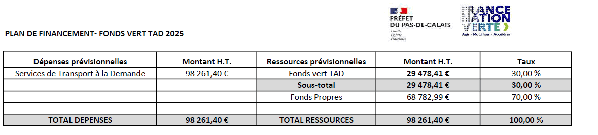 La mise en place du service de Transport à la Demande (TAD) est financé par l’État notamment par le biais du Fonds vert – subvention au titre du fonds d’accélération de la transition écologique dans les territoires.