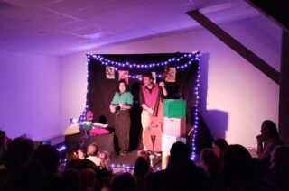Familles et enfants réunis pour un spectacle avant la reprise sous la neige.