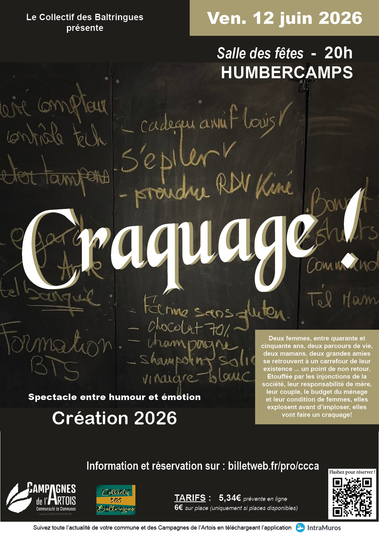 Dans une société où tout est mis en place pour ne pas craquer, deux femmes dans la quarantaine, deux parcours de vie, deux mamans, deux grandes amies se retrouvent à un carrefour de leur existence … un point de non retour. Étouffée par les injonctions, leur responsabilité de mère, leur couple, le budget du ménage et leur condition de femmes, elles explosent avant d’imploser. Elles vont le faire … et vous? Avec beaucoup d’humour, ce spectacle croque avec tendresse et lucidité les contradictions du quotidien féminin, offrant un moment jubilatoire où l’on rit, se reconnaît et se laisse emporter par une énergie à la fois libératrice et profondément humaine.