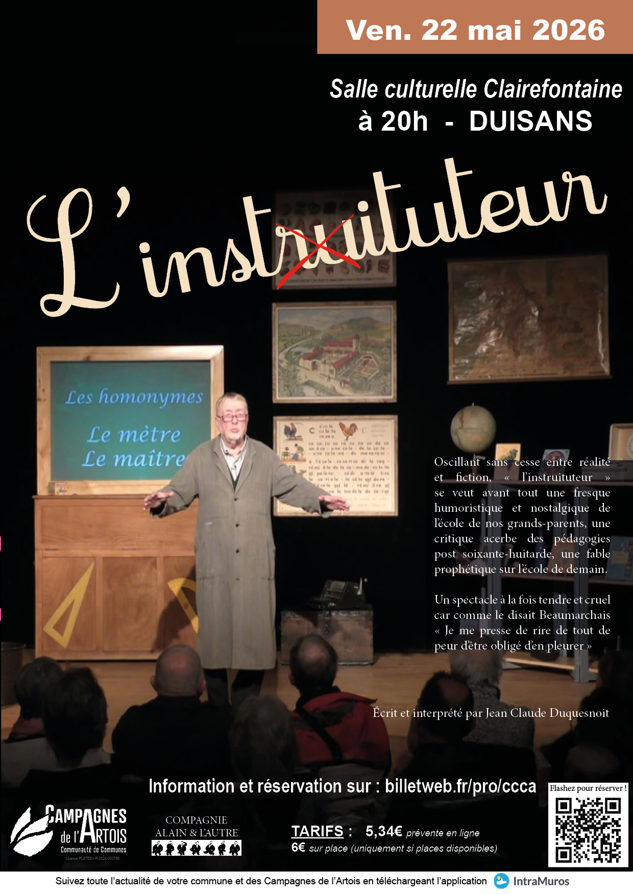 Oscillant sans cesse entre réalité et fiction, ” l’instruituteur ” se veut avant tout une fresque humoristique et nostalgique de l’école de nos grands-parents, une critique acerbe des pédagogies post soixante-huitarde, une fable prophétique sur l’école de demain. Un spectacle fois tendre et cruel car comme le disait Beaumarchais ” Je me presse de rire de tout de peur d’être obligé d’en pleurer ”