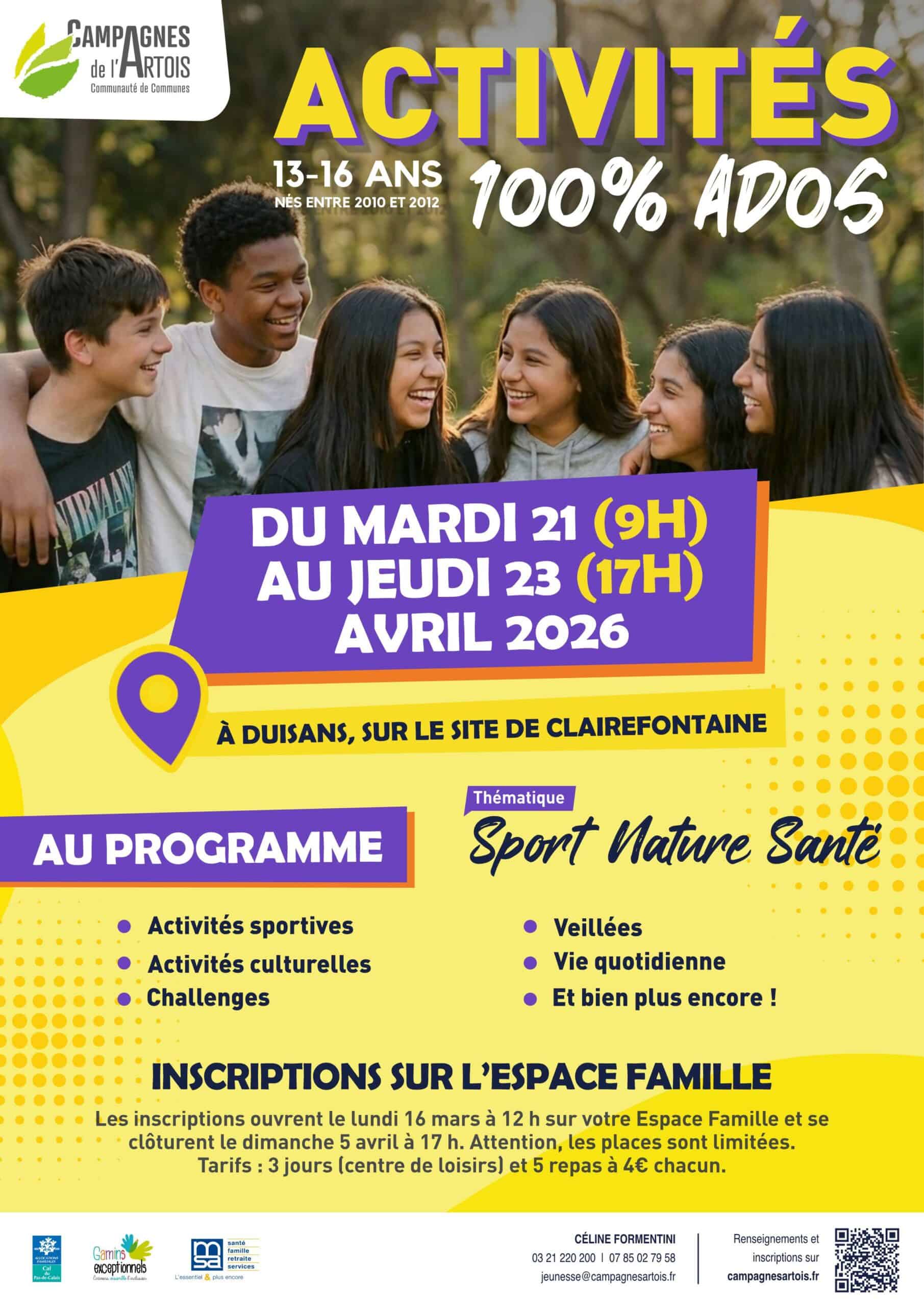 Ce printemps, la Communauté de Communes des campagnes de l’Artois te propose des activités 100% ados sur le thème « Sport, Nature, Santé ». Ici, pas de routine : on se dépasse, on s’amuse, et on prend soin de soi en pleine nature !