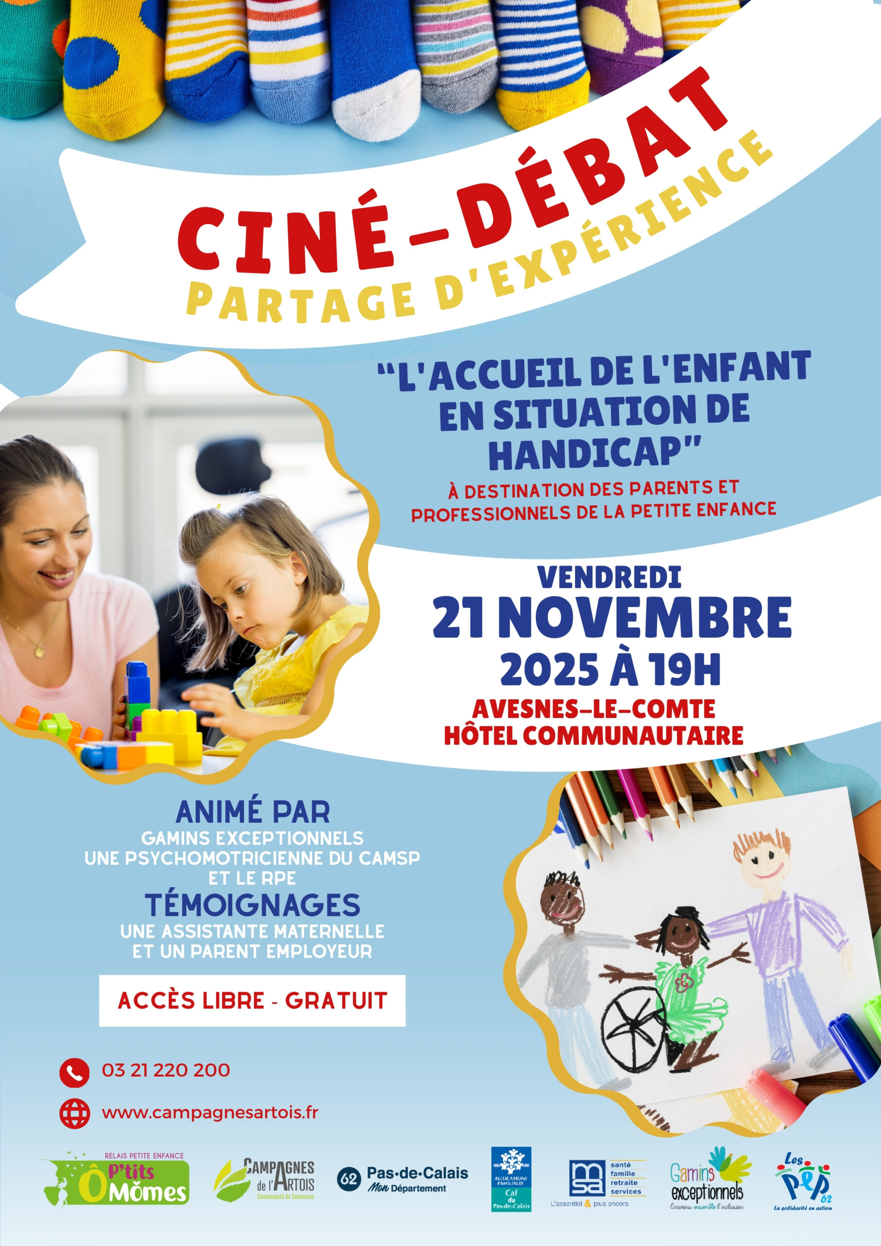 Dans le cadre de la sensibilisation sur l’accueil des enfants en situation de handicap chez une assistante maternelle, le Relais Petite Enfance “Ô P’tits Mômes” des Campagnes de l’Artois organise un Ciné-débat avec partage d’expérience à destination des parents et des professionnels(les) de la petite enfance.