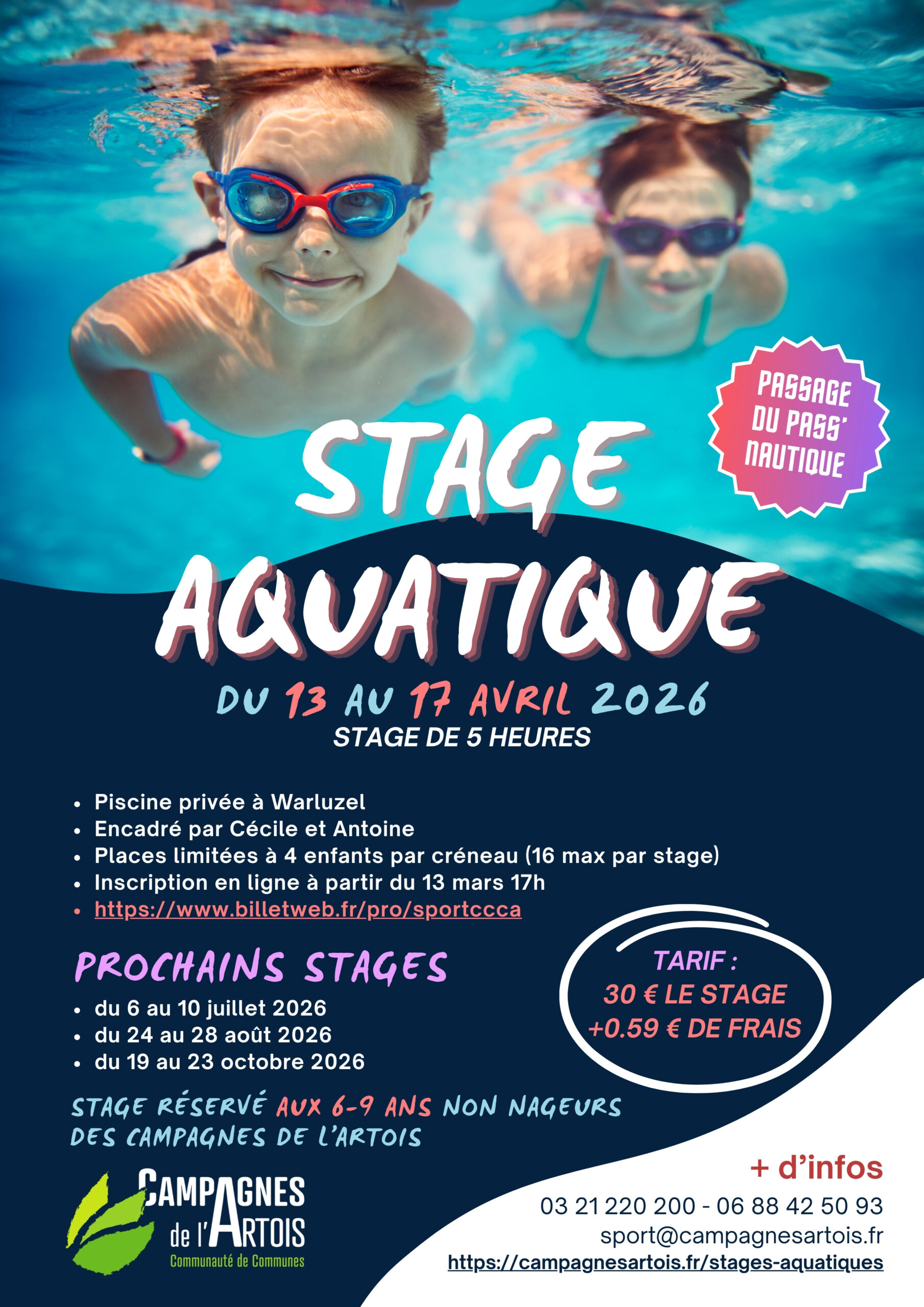 Le service sport des Communauté de Communes des Campagnes de l’Artois a proposé en 2025 quatre stages aquatiques, encadrées par des éducateurs sportifs de la CCCACommunauté de Communes des Campagnes de l'Artois à Warluzel dans la piscine d’un particulier sur 4 créneaux par jour.